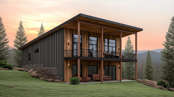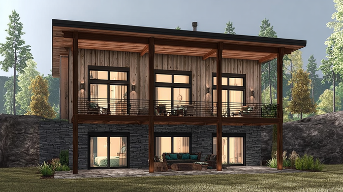 2,980 s.f. Modern single-sloped roof design with 2 Bedrooms, 2.5 Baths and plenty of outdoor space for relaxing or entertaining.It has a mix of Board & Batten siding, wood and stone but pratically any finished exterior material will work with this design.